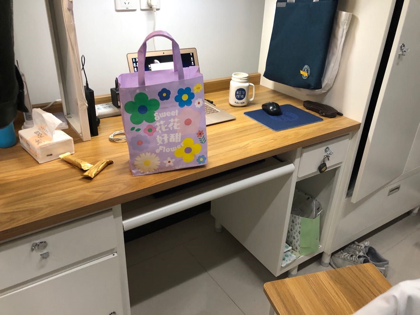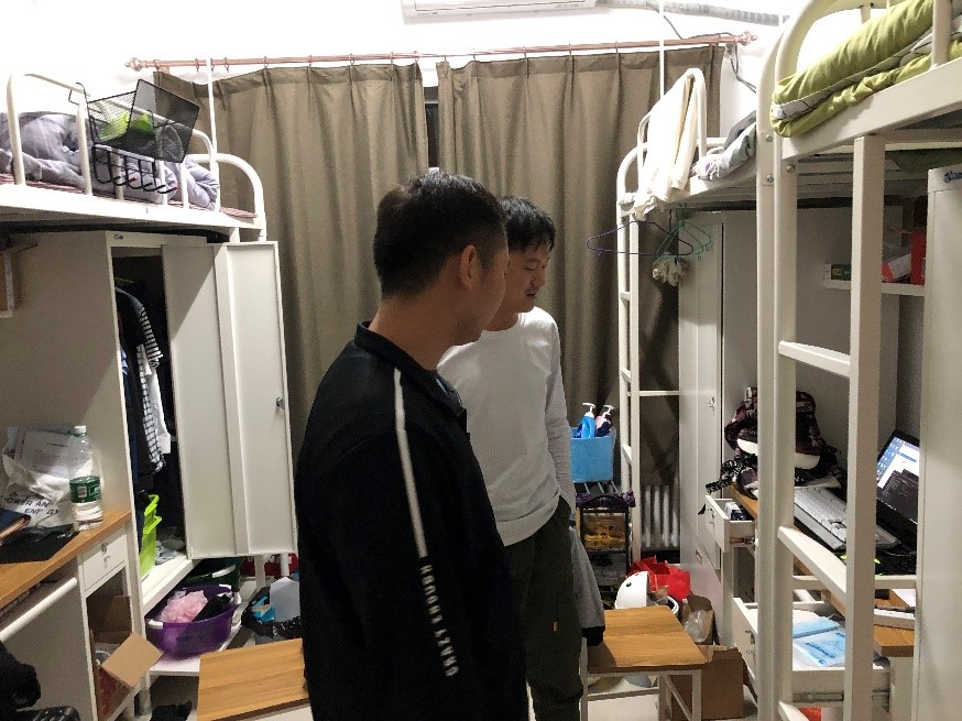 当晚,研究生辅导员白晓辉走进学生宿舍,代表学院送来节日的问候和祝福。白老师和同学们进行了亲切的交流,询问了大家的学习情况和生活情况,并强调平时一定要注意保持宿舍干净卫生及用水用电安全等问题。