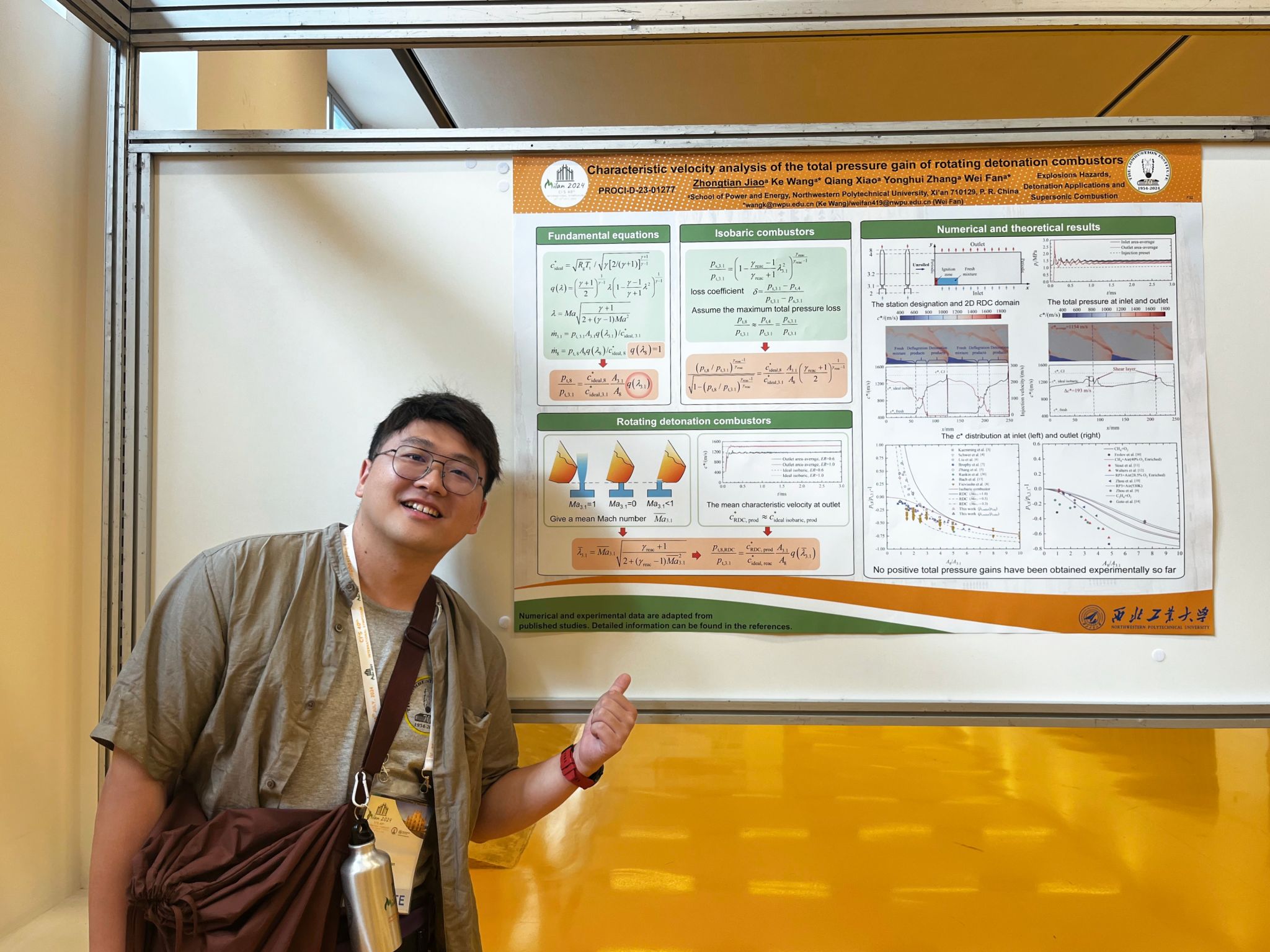 博士生焦中天做了题为“Characteristic velocity analysis of the total pressure gain of rotating detonation combustors”的海报展示。汇报以推进领域广受关注的旋转爆震燃烧室总压增益特性为背景,针对数值研究与实验结果中旋转爆震燃烧室增压能力的巨大差异,借助火箭发动机推力室设计常用的特征速度概念,剥离了在旋转爆震中紧密耦合的喷注和燃烧过程,构建了等压燃烧室与旋转爆震燃烧室总压增益(损失)与燃烧室出入口面积比的解析评估方法,为旋转爆震的燃烧室设计、总压增益能力的评估和优化提供了重要参考。 (论文原文://doi.org/10.1016/j.proci.2024.105626)