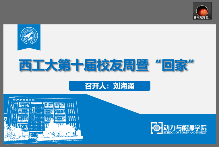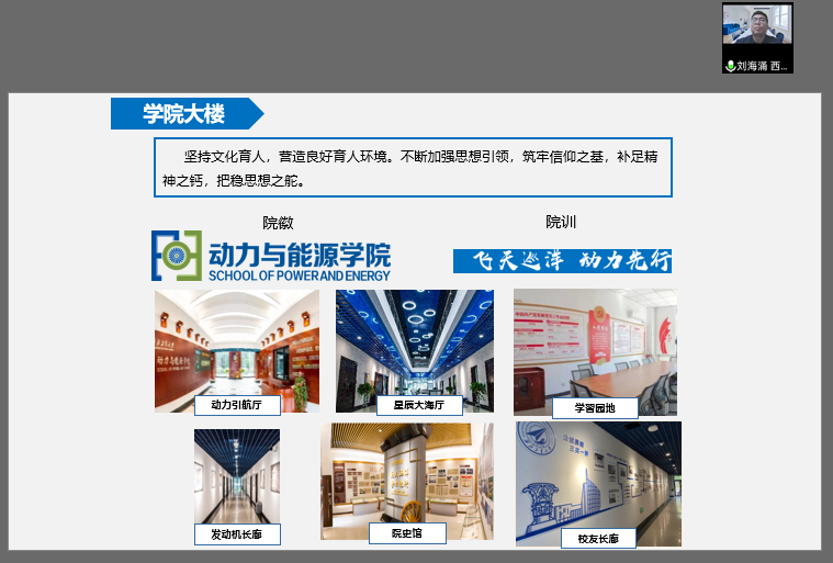 其次,刘书记向校友们进行了学院环境“云展示”,将学院的动力引航厅、星辰大海厅、党史学习园地、发动机长廊、院史馆及校友长廊等充分展示文化特色的学院环境以照片的形式向校友们进行了展示,校友们深刻感受到了学院的文化底蕴及巨大变化。