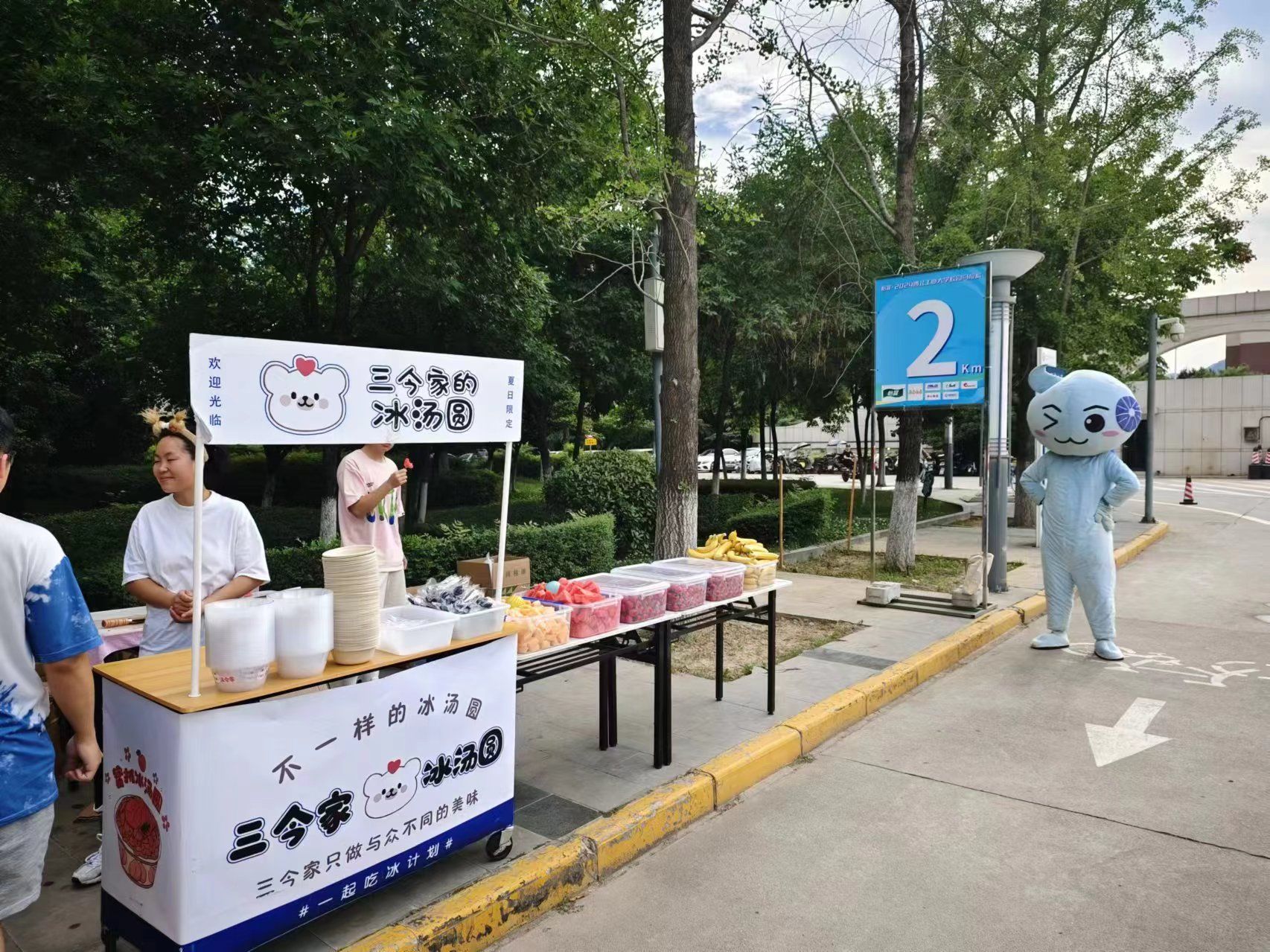 负责,志愿者早早准备好了夏日清凉的新鲜水果,还特邀三今家准备了200份冰汤圆。跑道上的竞争拼搏着青春的汗水,赛场上的互助也同样诠释着不褪色的友谊。秉持着活力传递,友谊长存的宗旨,学院在2km的补给站分发水果和冰汤圆广受全校师生的好评。