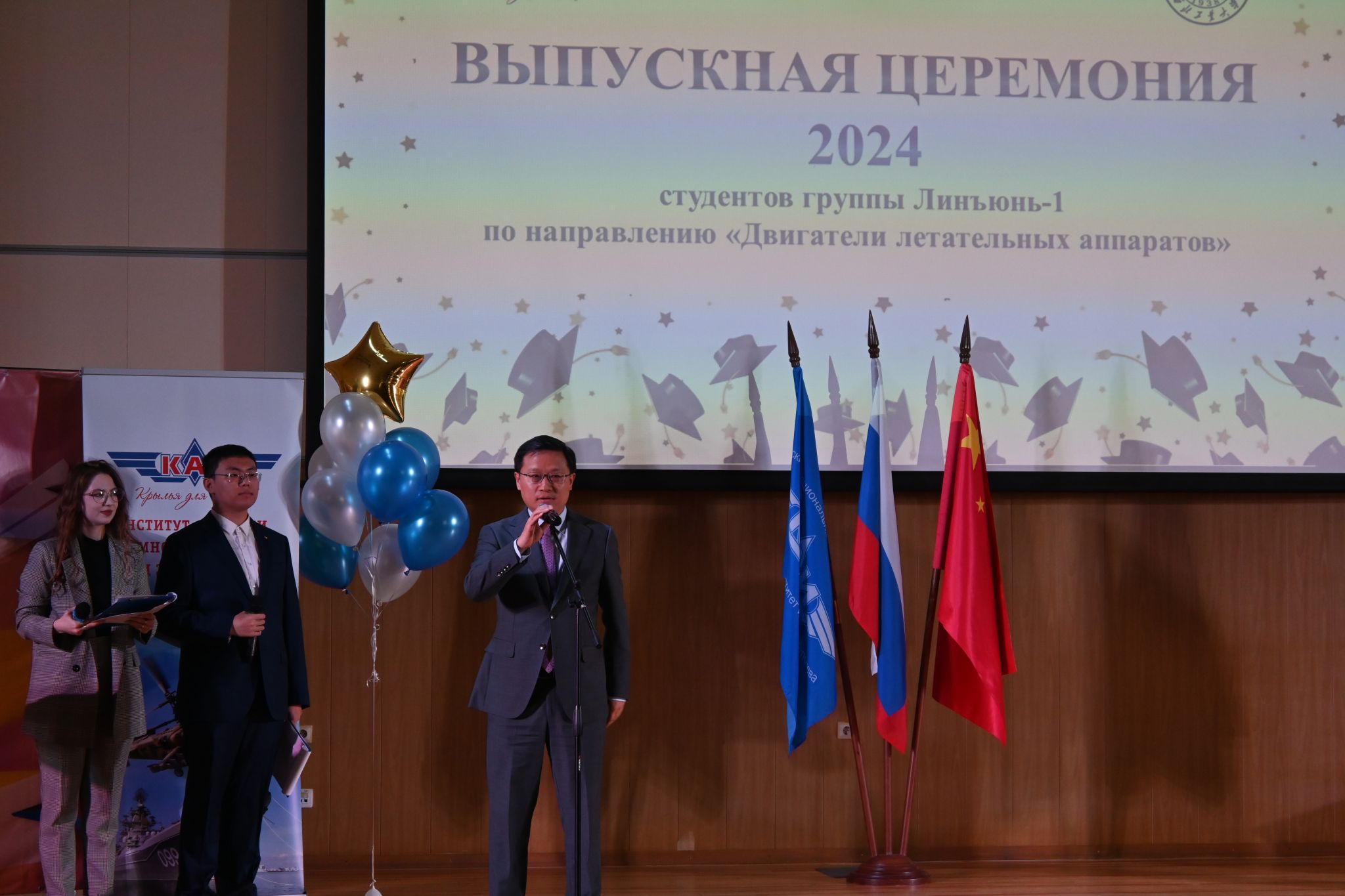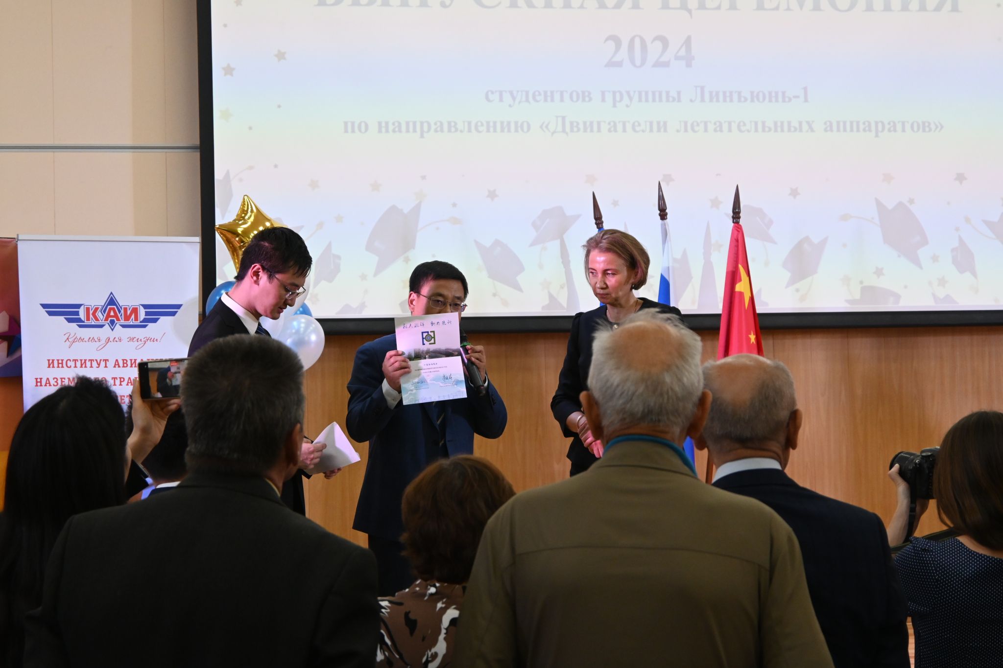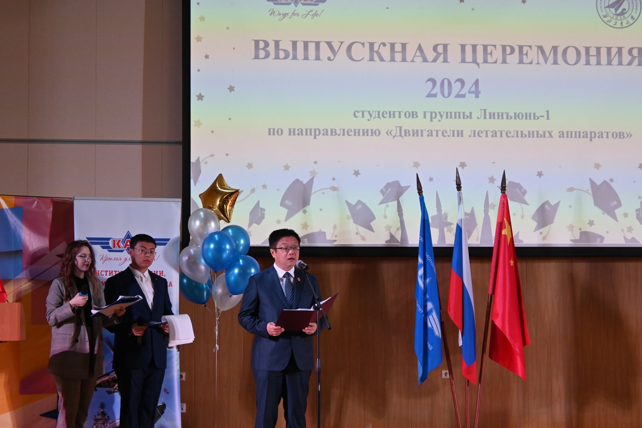 党委书记王占学在毕业典礼上赞扬同学们作为首届“凌云班”学子为后续西工大、喀航、萨马拉大学全方位合作做了很好的示范,祝愿大家带着自强向上的人生态度不断取得新辉煌,浩渺应无极,扬帆但信风。希望学子们能够牢记使命,为祖国的航发事业做出青春贡献,同时做好中俄友好的接力棒,让中俄科技交流、文化交流等结出更多硕果。王占学代表学院给每位毕业时赠送了包含某型航空发动机模型、“一宿舍两院士”签名和“为国铸剑”摆件的毕业大礼包。