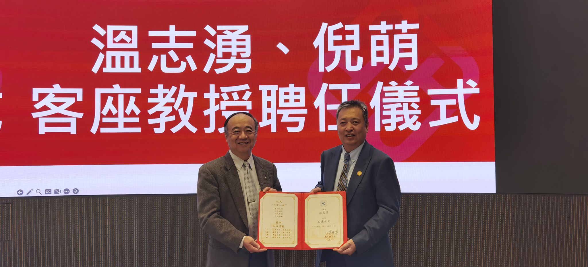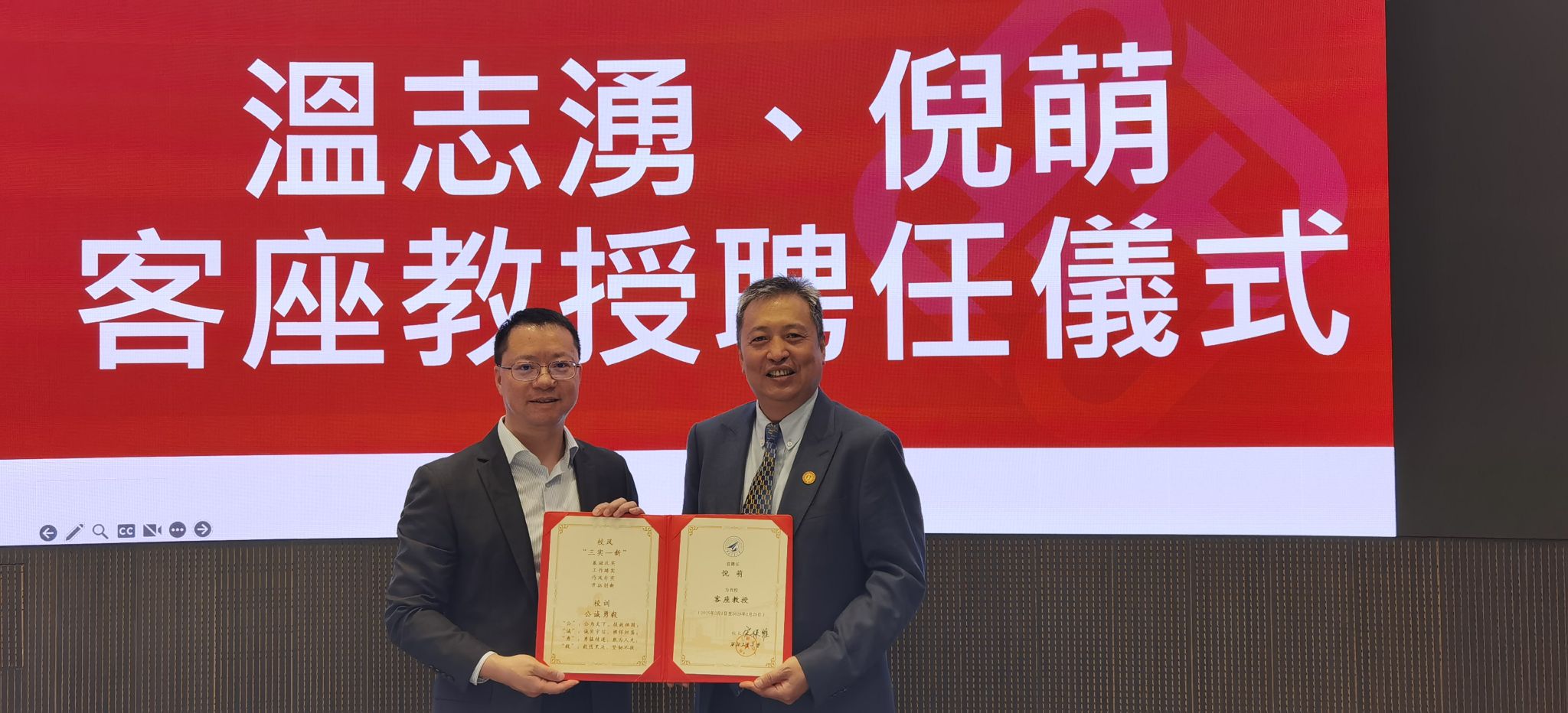 副校长侯成义、国际合作处副处长李自伟、人力资源部副部长宗凡等领导出席。宗凡副部长主持仪式。侯成义副校长为香港理工大学航空及民航工程学系系主任、讲席教授温志湧教授和建设及环境学院副院长、讲席教授倪萌教授颁发了聘书。两位教授表示将积极推进与学院的科研交流、人才培养等合作。