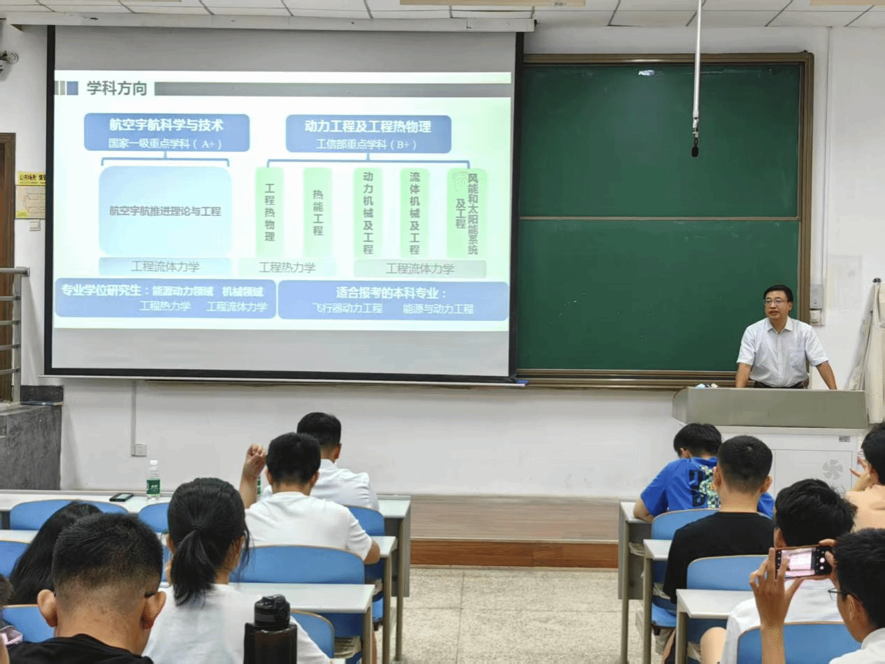 王占学书记以《飞天巡洋、动力先行》为题,为大家讲授了一场思政课,他从学院学科方向、优势资源、优势方向展示了学院在行业内的综合实力。同时他还分析指出了航空动力领域未来广阔的就业前景,帮助同学们坚定考研决心及对行业发展的信心。最后,王占学书记结合考研招生情况分析了当前考研形势,鼓励同学们利用好剩下的半年时间积极认真备考,争取获得满意的成绩。