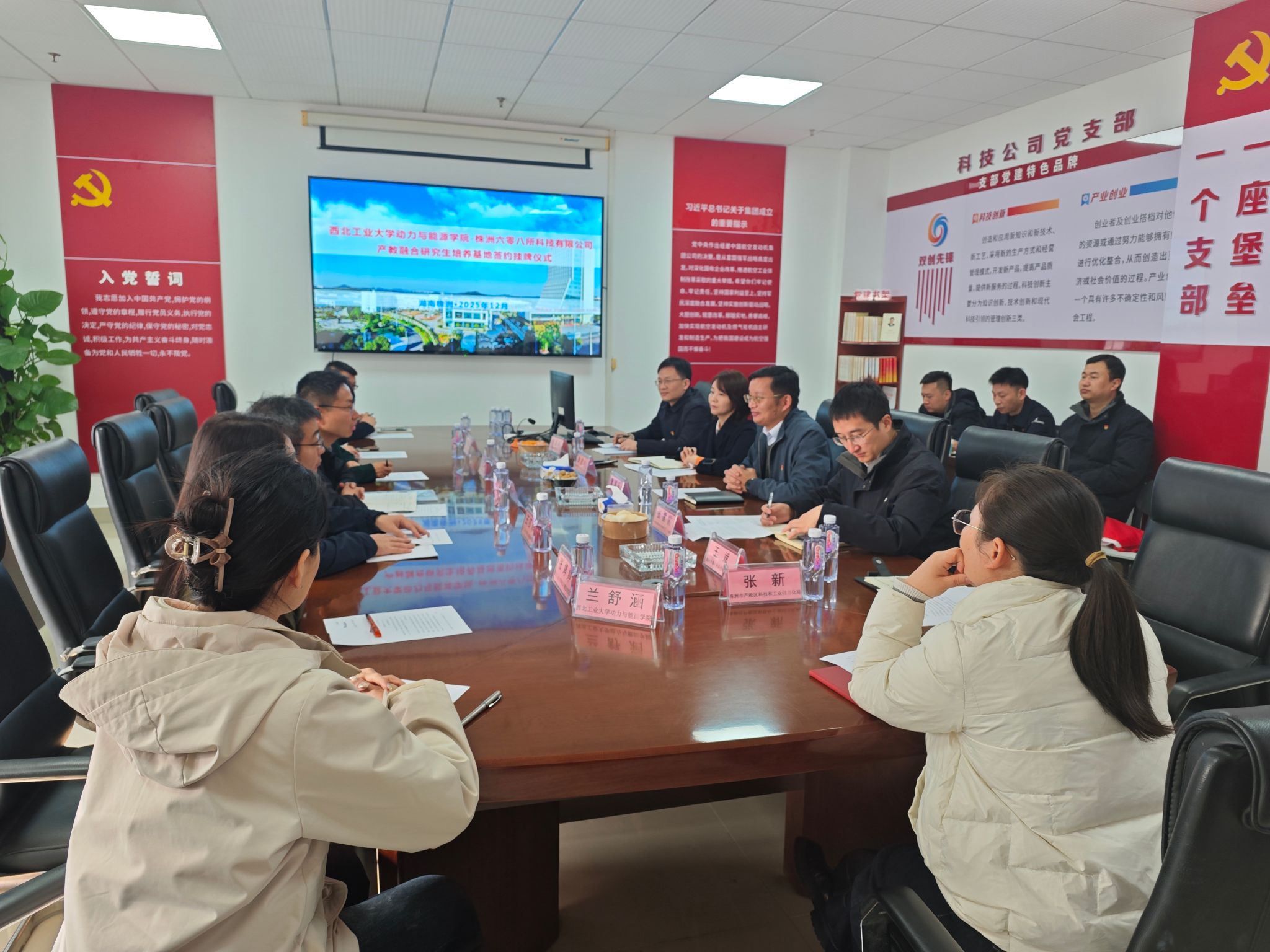 副院长王治武一行7人赴株洲六零八所科技有限公司签署产教融合研究生培养基地协议并与企业导师进行座谈交流。株洲市芦淞区科技和工业信息化局党组书记曾超群和副局长张新、中国航发湖南动力机械研究所人力资源部副部长张雷雷、株洲六零八所科技有限公司总经理曾培能和副总经理王斌以及各部门经理参会,会议由株洲六零八所科技有限公司党支部书记李迎春主持。