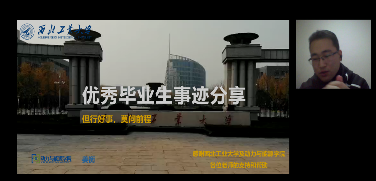 优秀毕业生代表姜衡通过线上会议,为大家分享自己的经验与体会,党委副书记刘海涌、研究生辅导员白晓辉、本科生辅导员李一帆与全院百余名学生共同参与了此次分享会。会议由本科生辅导员李一帆主持。