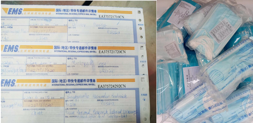 在做好各项防疫工作的同时,时刻牵挂着与我们有密切合作的俄罗斯喀山国立技术大学、萨马拉航空航天大学以及乌克兰哈尔科夫航空航天大学等三所海外合作院校,了解到当地因疫情持续发展,急需防疫物资。三月下旬,学院竭尽全力购买筹措防护物资,在充分了解相关国际防疫物资邮寄政策后,分别向俄罗斯喀山国立技术大学和萨马拉国家研究型大学各捐赠3000只口罩,向乌克兰哈尔科夫大学捐赠2000只口罩。