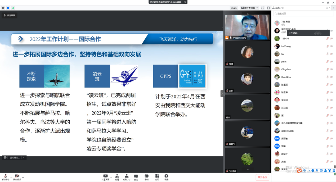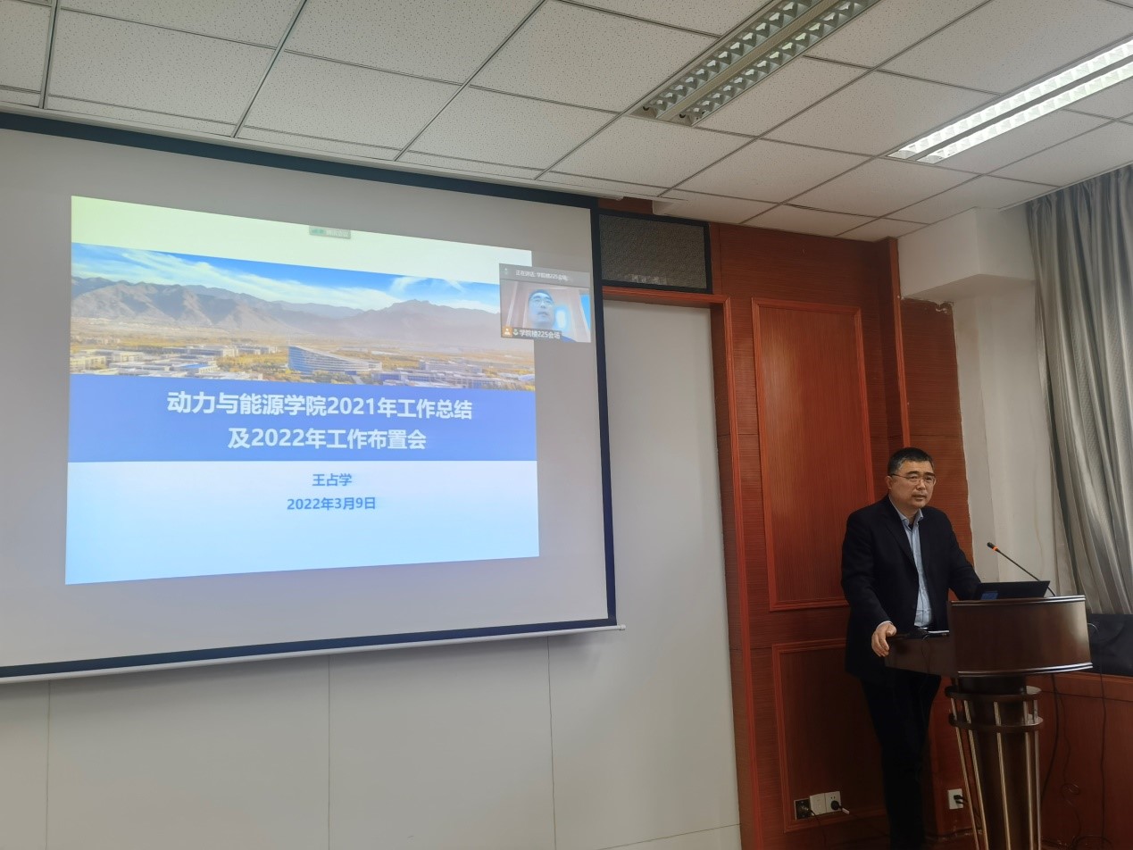 首先,王占学院长做工作报告,王院长对2021年工作情况进行了总结,同时对2022年的重点工作进行了部署。作为“十四五”的开局之年,学院在2021年已经取得了一定的成绩,但对标学校“双一流”目标要求,还需不断努力,王院长从人才培养、科学研究、师资队伍、党建思政、国际化等方面,部署了学院2022年的重点工作,提出全院师生要抢抓机遇,同心同力,共促学院发展。