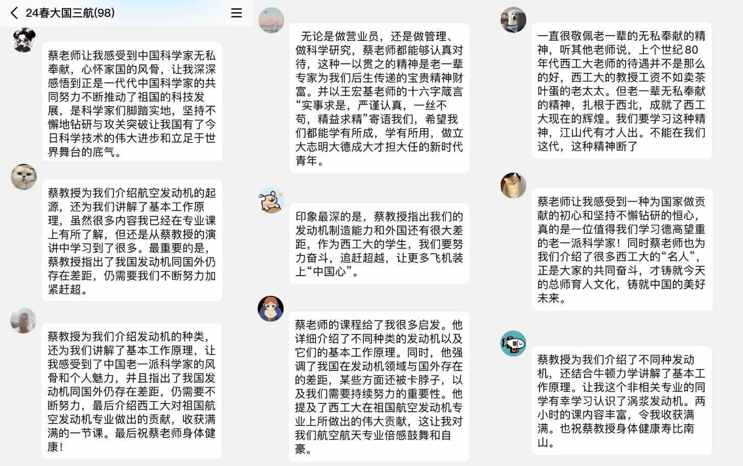 蔡元虎教授作为专家老师,在学校开设的特色思政选修课“大国三航”上为来自全校不同学院的学生讲授航空发动机的相关知识。马克思主义学院贺苗老师说:“2021年因为开设《大国三航》课程得以认识蔡教授,古稀之年上课却似少年般激情恳切。……他每次课前都主动发来课件开心分享又更新了哪些内容。”学生最能感知老师的用心用情育人——