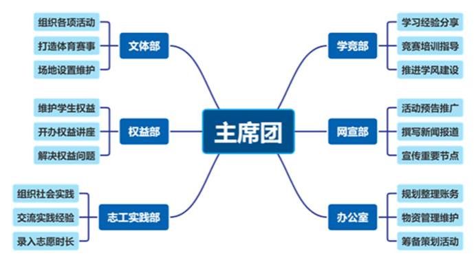 学生会以主席团为核心,下设六个职能部门:办公室,学竞部,文体部,网宣部,志工实践部和权益部。