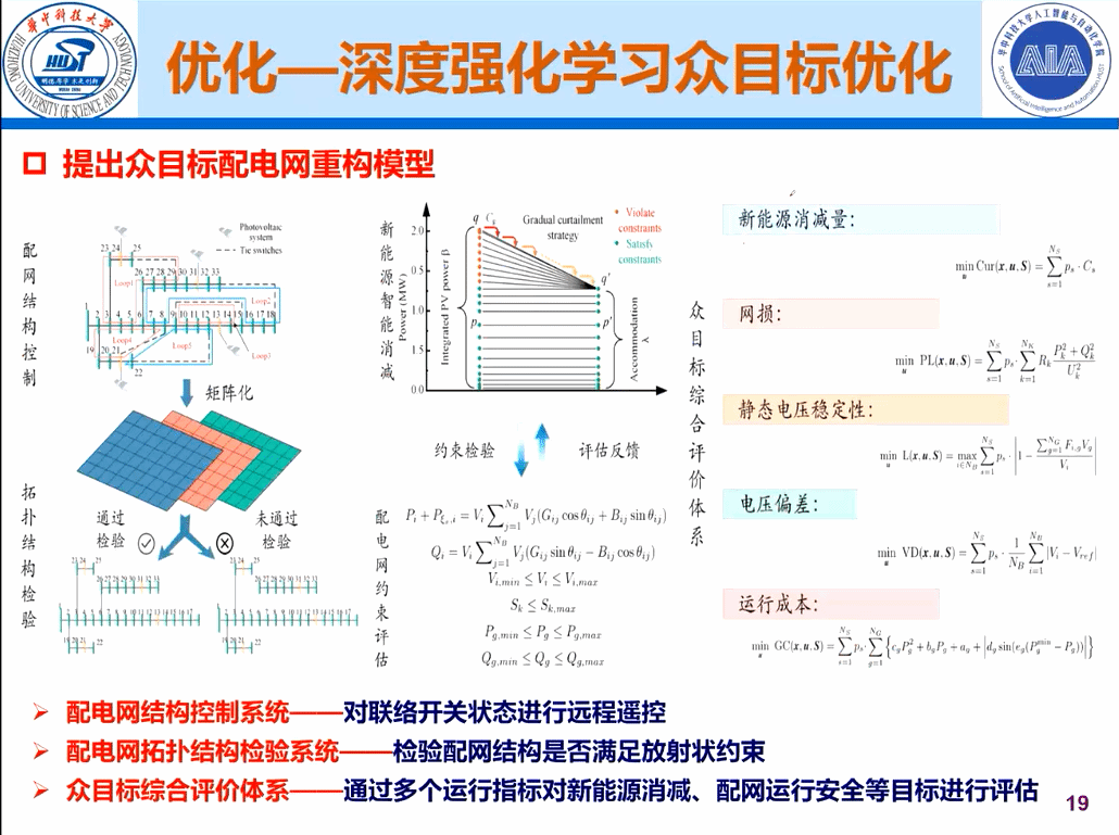 其次,针对电网优化难度大的问题,李远征副教授提出深度强化学习众目标优化的解决措施。随着新能源并网比例逐渐攀升,其随机性与波动性使得配网安全运行难以保障,并进一步引发了弃风、弃光现象。通过对配网拓扑结构进行调控,改变支路电流通路,从而降低网损、均衡负荷、改善电压质量与配网运行安全等。但是传统的重构方法存在单一或少量目标难以包含更多有效信息,难以全面刻画配网运行状态,从而较难合理地配网拓扑结构调控的问题。李远征副教授提出众目标配网重构方法与基于深度强化学习的优化算法。但是这又引起了新的问题。高维目标空间致使非支配解数量产生指数级增长,致使传统多目标优化算法(NSGA-I,MBFO)丧失选择压力,算法寻优效率下降。为此需要利用深度强化学习与配电网模型交互,从而学习状态、动作、奖励间的隐式关系,进而指导多目标优化算法种群运动,实现帕累托前沿的快速逼近。