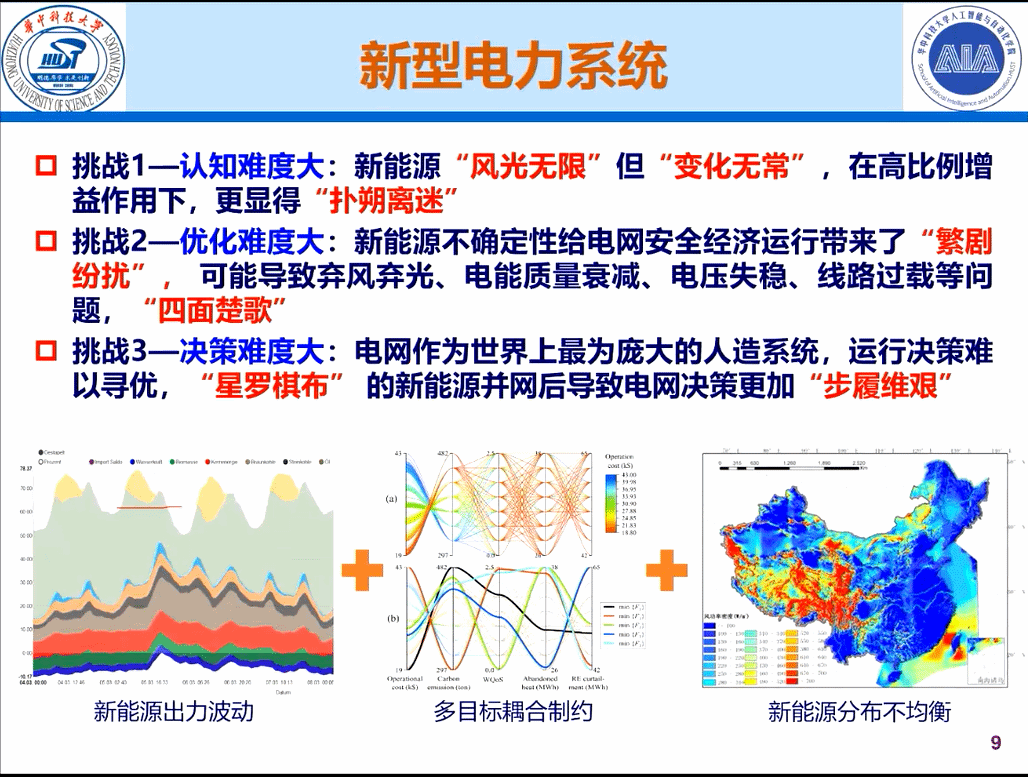 针对构建以新能源为主体的新型电力系统问题,李远征副教授基于自身研究提出了三点挑战。挑战1—认知难度大:新能源“风光无限”但“变化无常”,在高比例增益作用下,更显得“扑朔离迷”。挑战2—优化难度大:新能源不确定性给电网安全经济运行带来了“繁剧纷扰”,可能导致弃风弃光、电能质量衰减、电压失稳、线路过载等问题,导致“四面楚歌”。挑战3—决策难度大:电网作为世界上最为庞大的人造系统,运行决策难以寻优,“星罗棋布”的新能源并网后导致电网决策更加“步履维艰”。