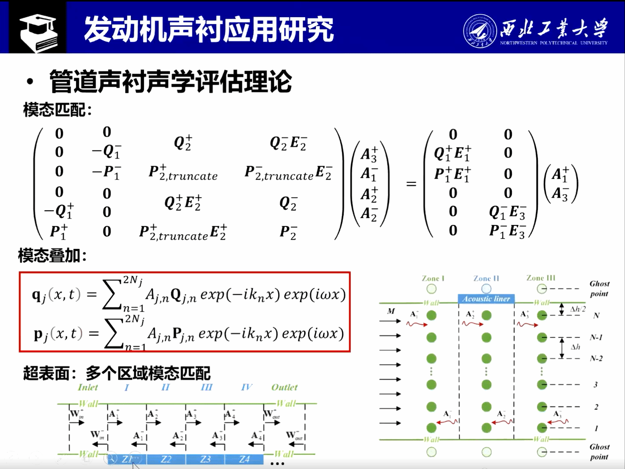 然后周杰教授介绍了管道声衬声学评估理论,深入讲解了空气-多孔材料界面处理方法以及流动条件下多孔材料与空气声场信息传递方法。针对发动机声衬应用研究,周杰教授团队将多模态方法与NASA的实验数据进行了对比,理论解与实验数据符合较好,同时开展静态下阻抗管验证性测试研究,进一步验证其团队开发的多模态方法的可靠性。