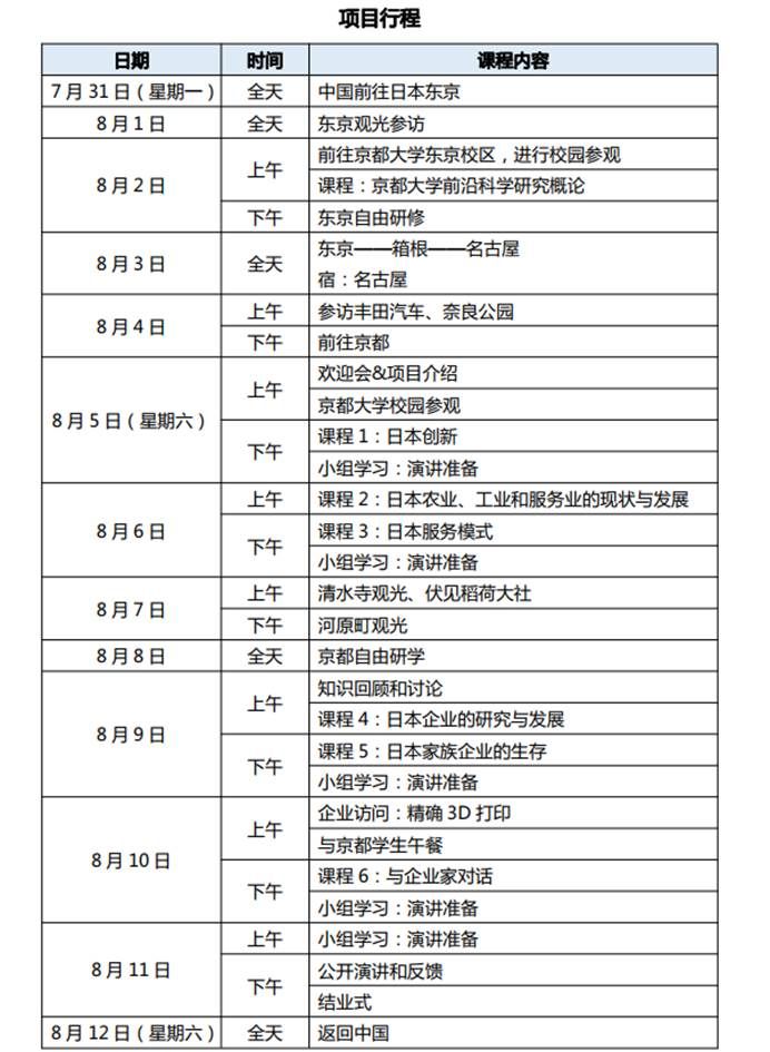 为推动国际化教学进程,拓宽中日大学互教互学道路,以培养学生国际化视野、异文化思考、创新意识等综合素质为目的,生田国际株式会社(Ikuta Global co.,ltd.)获得京大产学研公司(Kyoto University Original co.,ltd.)支持,设计开发了传统与创新的课程模块。为中国大学生量身打造创新、商业、社会等相关课程,让学生们能够近距离的感受并学习到日本高科技创新企业的传统文化基因、了解传统日本社会的创新基因。小组分组讨论发表的上课形式引发学生积极思考。除了接受课程学习,企业考察及文化交流以外,我们将带同学们参观千年古都京都的清水寺,伏见稻荷等,在现代与古老之间领略神秘而富有魅力的日本文化。