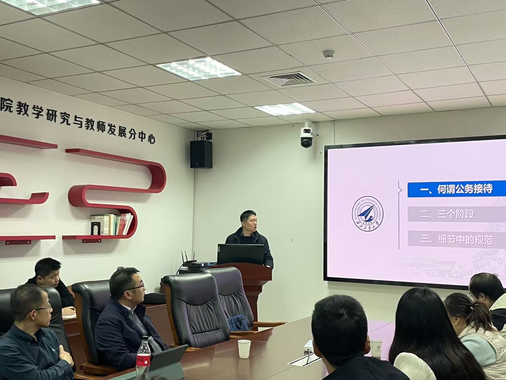 党政办魏征老师从“何谓公务接待”、“公务接待的三个阶段”、“公务接待细节中的规范”三个方面,结合实事案例,为大家分享了自己在公务接待方面的思考体会。魏老师强调,公务接待时要留有余量,提前思考问题,并且要认真细致,将事情办到实处。